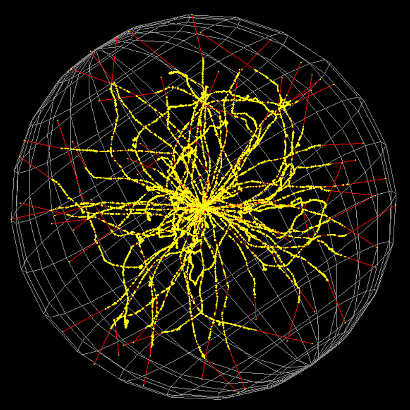 This image is from an investigation involving Geant4-DNA Monte Carlo simulations (a computer modelling method) to study how gold nanoparticles (GNPs) influence the production of reactive oxygen species (ROS) when exposed to ultra-high dose rate (UHDR) electron-beam irradiation. Electrons with an energy of 1 MeV are directed toward the center of the GNP sphere from its surface, generating secondary electrons (yellow dots) along their tracks (solid red lines). These interactions help scientists understand how combining UHDR electron beams with GNPs can enhance radiation effects on cancer cells. The findings provide a theoretical foundation for future research aimed at developing more effective radiotherapy treatments.