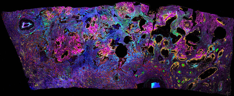 This image captures a single pancreatic tumour containing two distinct environments side-by-side. Using imaging mass cytometry, we mapped how cancer, immune and supporting cells organize themselves inside the tumour. On the right, tumour cells in light blue are termed “classical” where the tissue around them is orderly and draws immune cells (green) inward to kill tumour cells; patients with this pattern tend to do better and respond to chemo. On the left, “basal” tumour cells in yellow dominate: the tissue is disordered, immune cells are kept out, and outcomes linked to this pattern are worse due to poor chemo response. The result is a microcosmic divide of pancreatic cancer’s extremes, two opposing ecosystems coexisting in one tumour. By mapping these spatial patterns and cell-to-cell interactions, we aim to uncover the biology shaping outcomes to guide better treatments for patients.