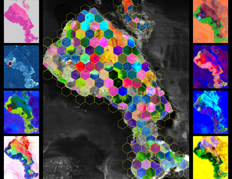 We analyzed a slide of human colorectal tissue using DESI mass spectrometry imaging, a method that measures thousands of molecules directly on the tissue—no dyes or labels. The result is a set of spatial biochemical maps showing where molecules concentrate in and around cancer. With MassVision, code-free platform, we created complementary visualizations: known molecules (targeted), data-driven discoveries (untargeted), local signal differences (local contrast), and maps aligned with a histopathology (co-localized). We then arranged mosaics of these maps that preserves the tissue’s true layout. All images are real measurements, not simulations. Making these molecular patterns visible can help researchers see cancer and tissue heterogeneity and generate ideas for diagnosis and treatment.