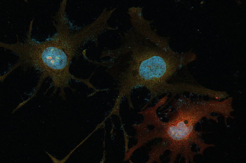 Glioblastoma is an aggressive brain cancer whose cells can change identity. This image shows patient-derived tumor cells nudged to mature. We stained S100B (red), a protein found in astrocyte-like cells, and NEUROD1 (green), a switch that promotes neuronal fate. In the center, two neighboring cells glow yellow where red and green overlap, evidence of a mixed, in-between state, while, to the right, a third cell is mostly red, suggesting an astrocytic bias as NEUROD1 fades. Such plasticity helps tumors resist therapy. Our work asks how the receptor OSMR inhibits differentiation, and tests ways to push more cells into a stable, non-stem fate that could make tumors less aggressive and more responsive to treatment.